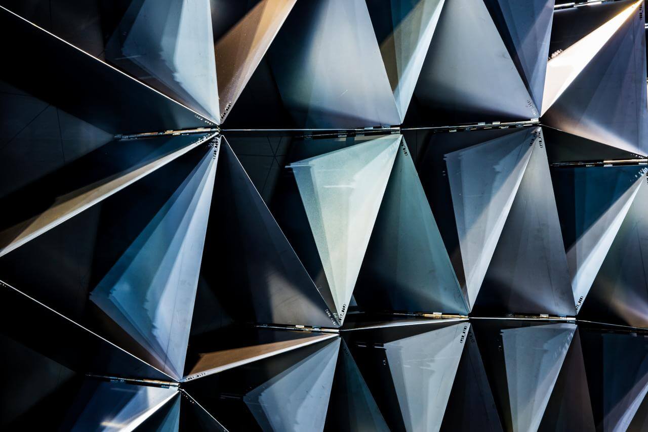 連続して結合した不等辺三角形の集合体は、実験的な試みとして意図された形状です。