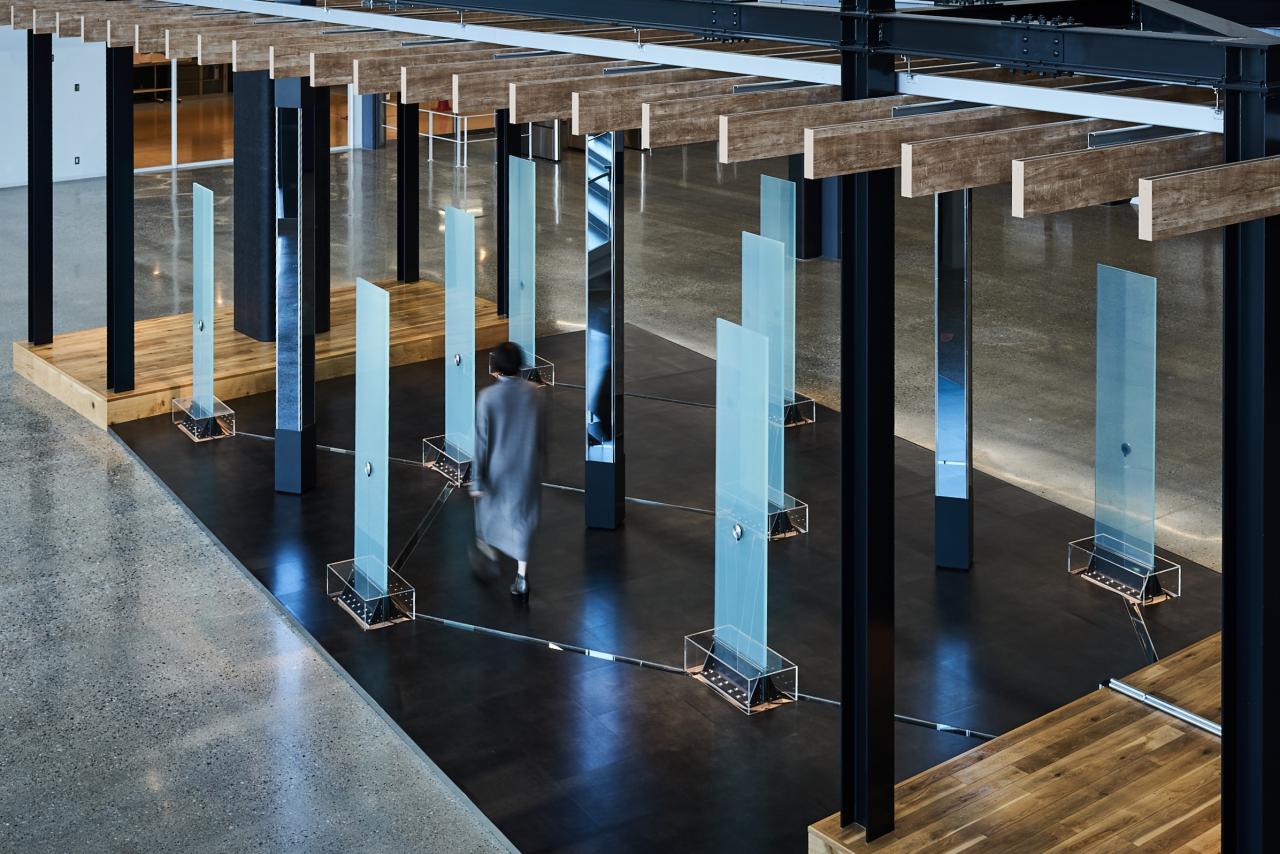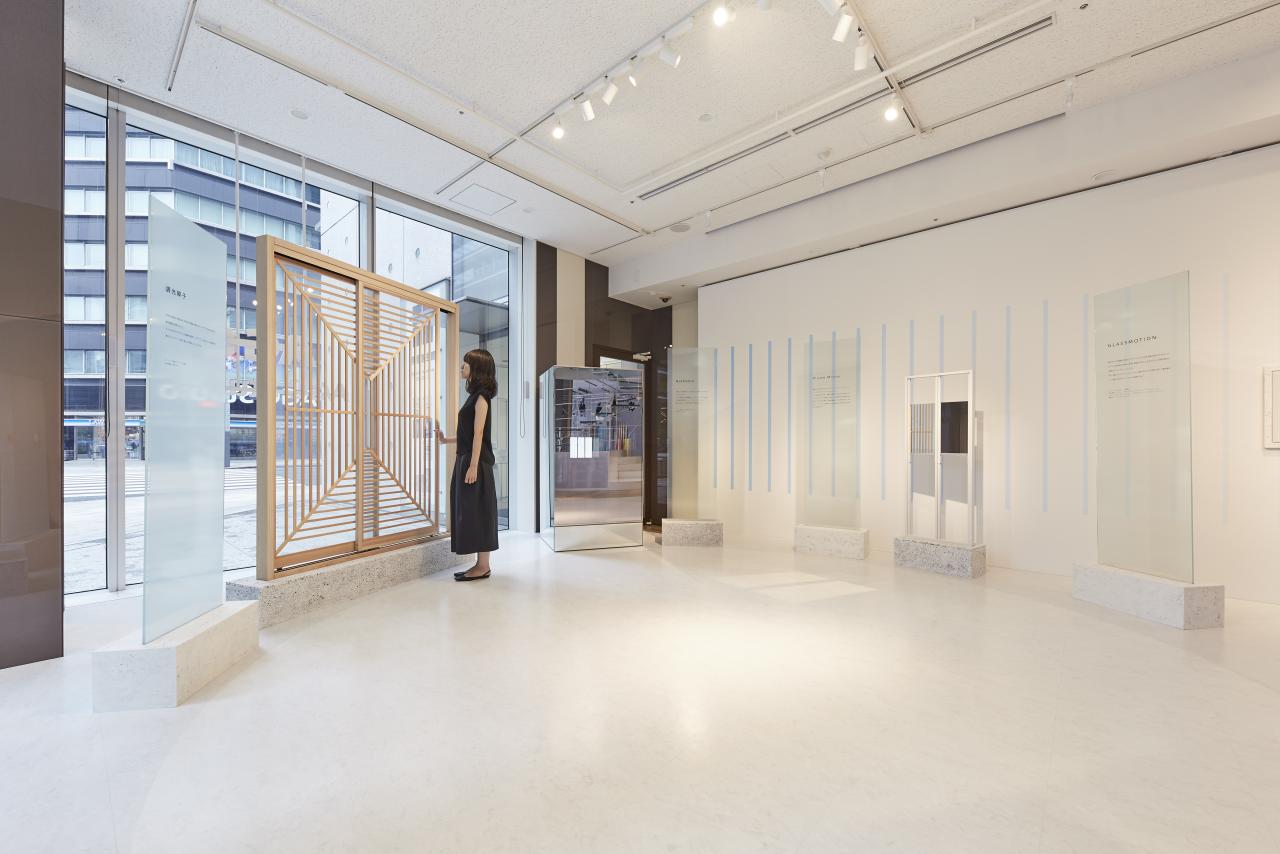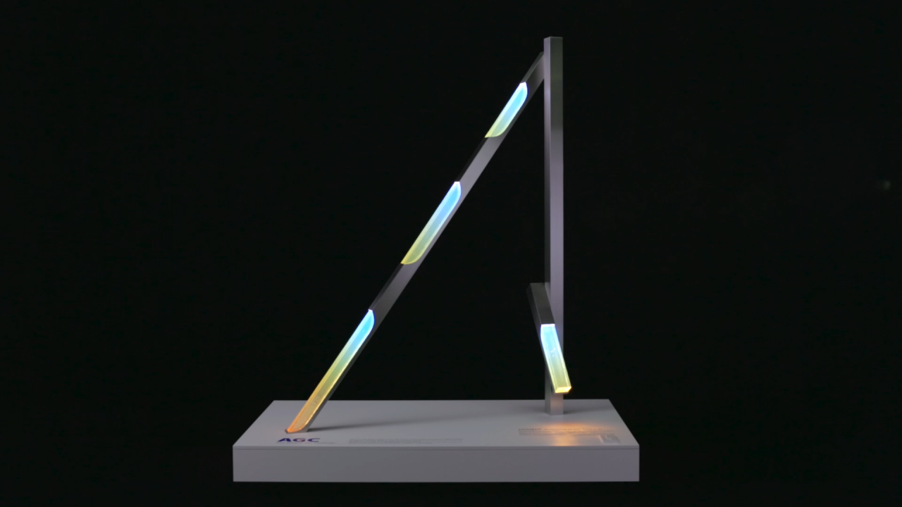 電気を流すことで透明度の変わるガラス、貼ることで貼った面から音がでるスピーカー、ミラーと一体になった境界の分からないディスプレイ、光を通すことで、ブルーモーメントを再現するガラスなど、ひとつひとつ不思議な特性を持つマテリアルたちをメディアと捉えて、組み合わせることでオーケストラを作った。マテリアルのメディア化によって作られた空間は普段の使用方法とは違い、様々なイマジネーションを生み出す。