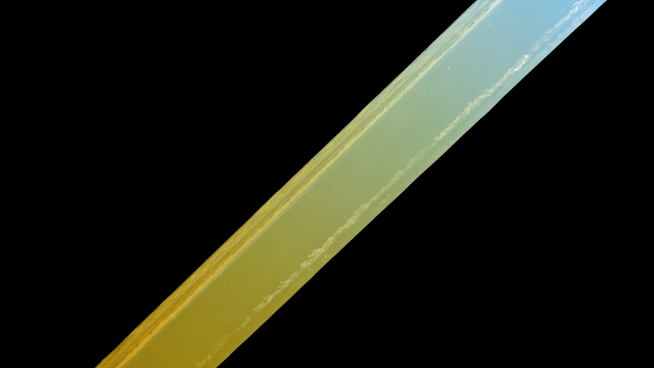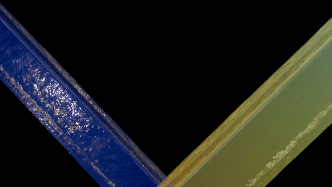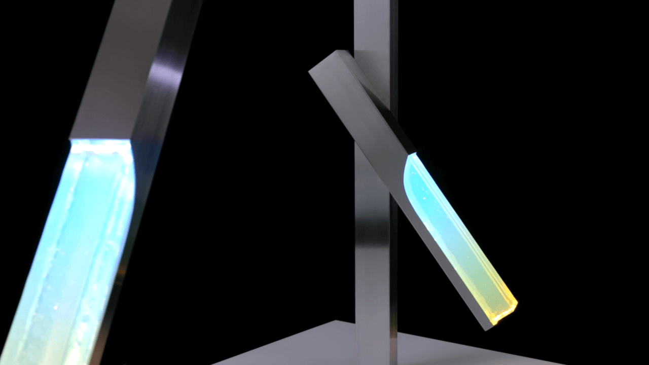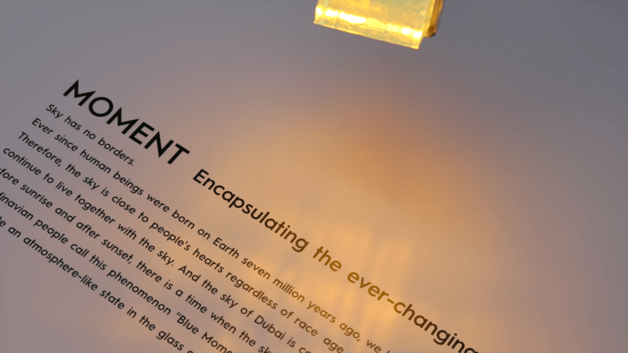 AGCが開発した技術によりガラスの中に大気と同様の状態を作り出し、太陽光に見立てた白いLEDとライトと相互作用を引き起こすことで日の入りから日の出までを表現、時の移ろいを創り出しています。