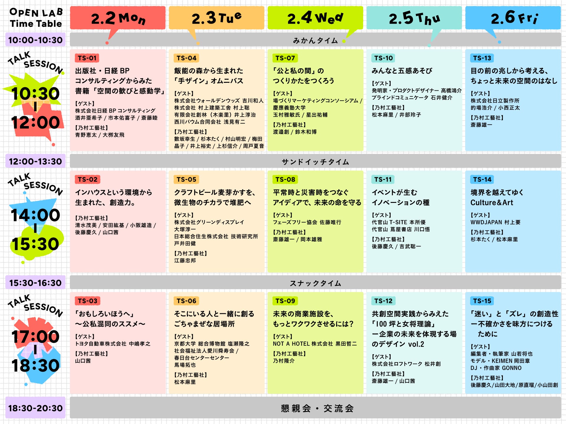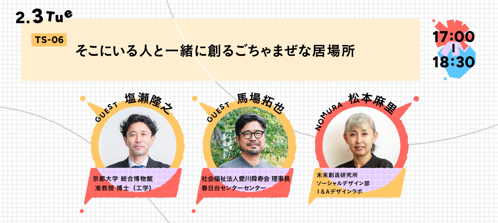 多様な人が集い、思いを交わしながら居場所をつくっていく——。今回のイベントでは、場を使う人・創る人・働く人がそれぞれの視点や実感を持ち寄り、その思いをごちゃまぜにしながら「居場所とは何か?」を一緒に考えていきます。有識者と事業者が、実践と知見の両面から“混ざり合うプロセス”を深掘りし、誰にとっても心地よい空間がどのように生まれるのかを紐解いていきます。空間づくりは特定の誰かのためだけではなく、みんなでつくりあげる「みんなのもの」であること、ごちゃまぜのプロセスが誰もが心地よい居場所を創る鍵となる、ごちゃまぜの視点が交錯することで、空間づくりのアプローチを探ってゆきます。※TS-06は申し込みを締め切りました。