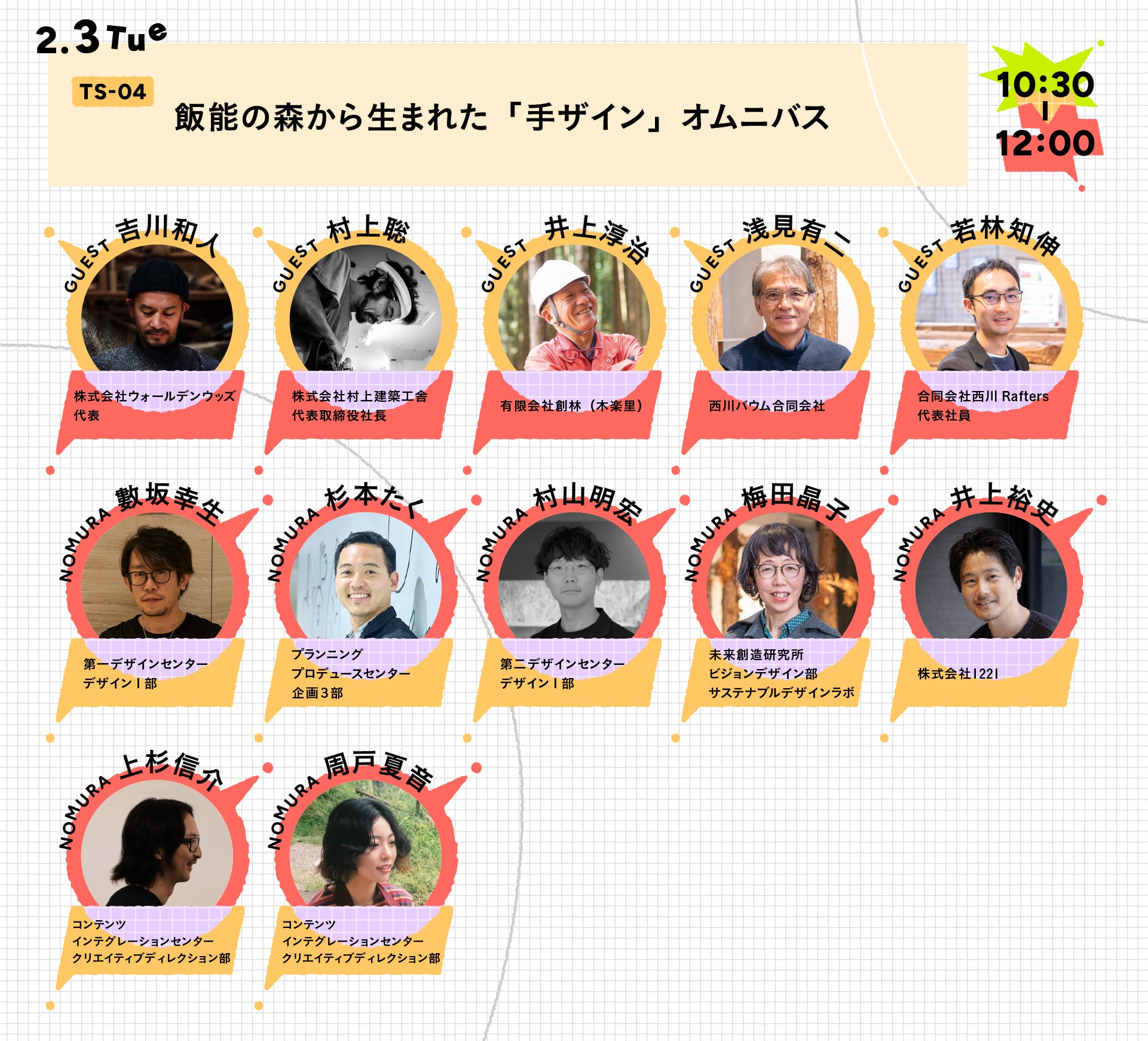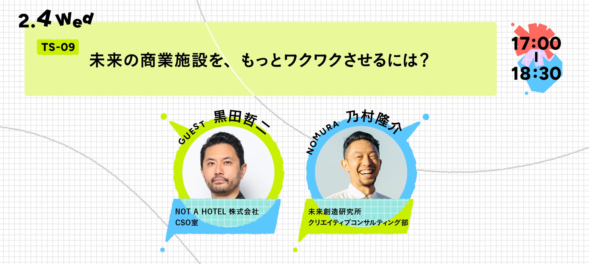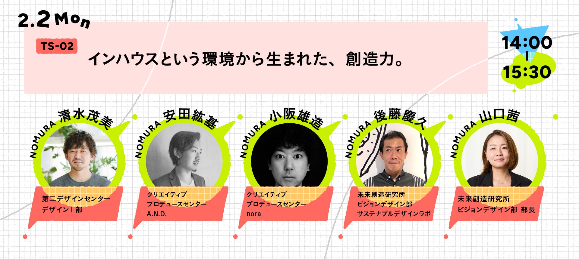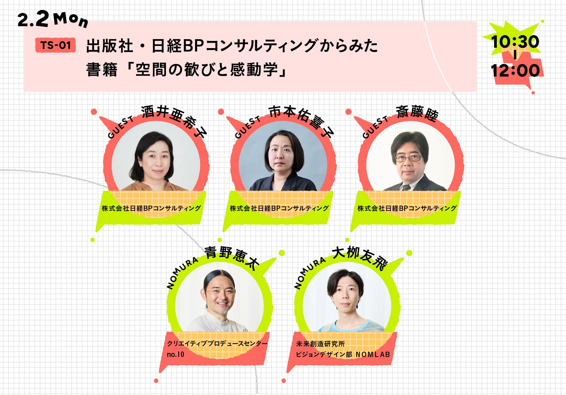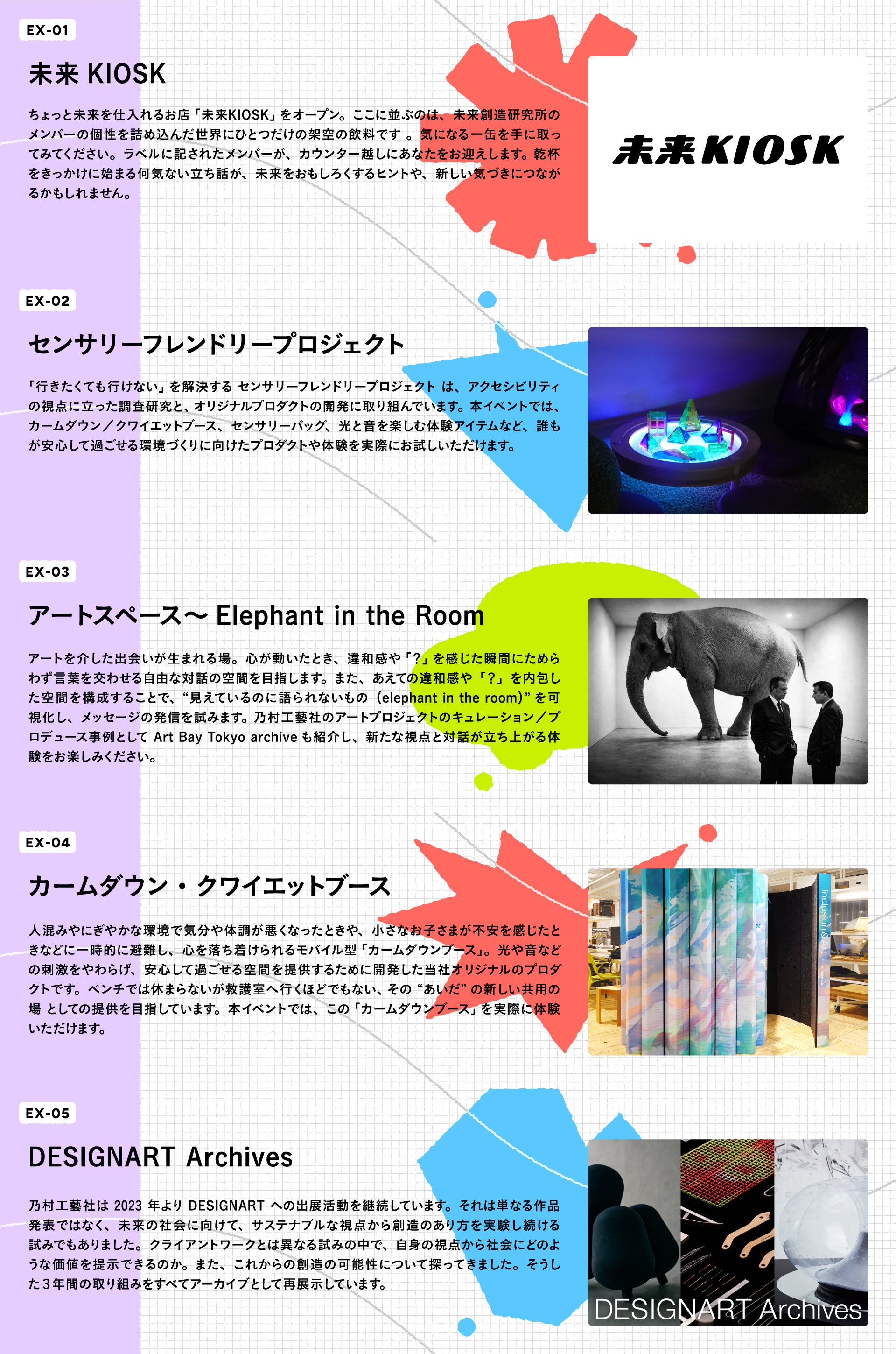- 当日は、乃村工藝社及び登壇関係者による写真・動画の撮影や、マスメディアによる取材が入る可能性があります。撮影された写真・動画等は、各社ウェブサイト、メールマガジン及びSNS等、並びにマスメディアへの情報提供等、記録及び広報目的で公開・利用させていただく場合がございますので、予めご了承ください。