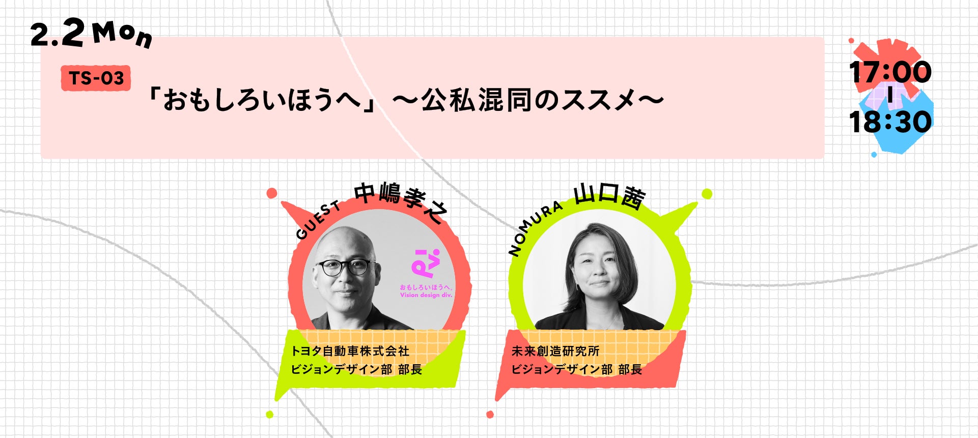 変化の激しい時代、企業が“生業の先”にある未来をデザインするには、何が大切だろう。乃村工藝社でR&Dをやってみて思うのは「個人のパッション」の重要性。どうやってプロジェクトを創発している?どんな風にチームを創っている?などなど、トヨタ自動車ビジョンデザイン部を率いる中嶋さんが掲げる「おもしろいほうへ」というステートメントに込めた想いを紐解きながら未来を動かすデザイン組織の条件を多角的に議論します。※TS-03は申し込みを締め切りました。