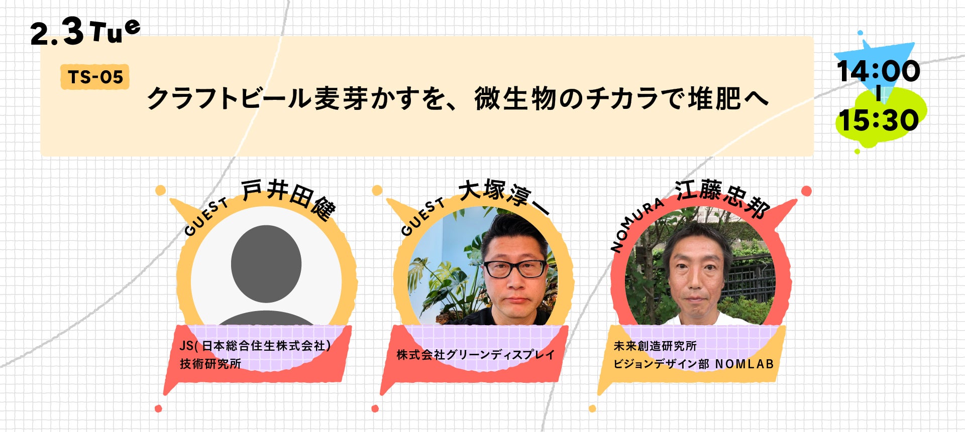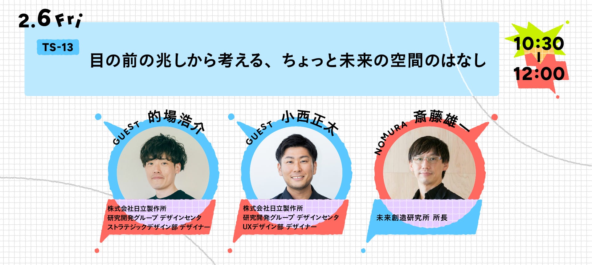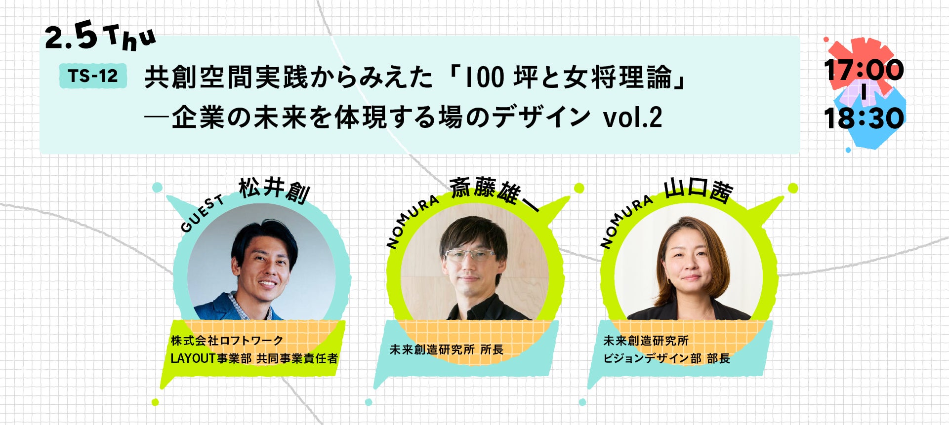 これまで、さまざまな企業の共創空間づくりに関わってきた私たちが、自ら場を持ち、実際に運営してみました。すると、設計図だけでは見えなかった悩みや、空間が人の行動や関係性をそっと変えていく瞬間に、数多く出会うことになります。さらに他社の担当者の方々と話していると、不思議と似た話が繰り返し聞こえてきました。広さはだいたい100坪が心地いいこと。もうひとつは、場の環境や空気を凛と整える「女将」のような存在がいること。この二つがそろうと、場は自然と動き出します。本セッションでは、そんな気づきを手がかりに、共創空間の本質を一緒に紐解いていきます。※TS-12は申し込みを締め切りました。
