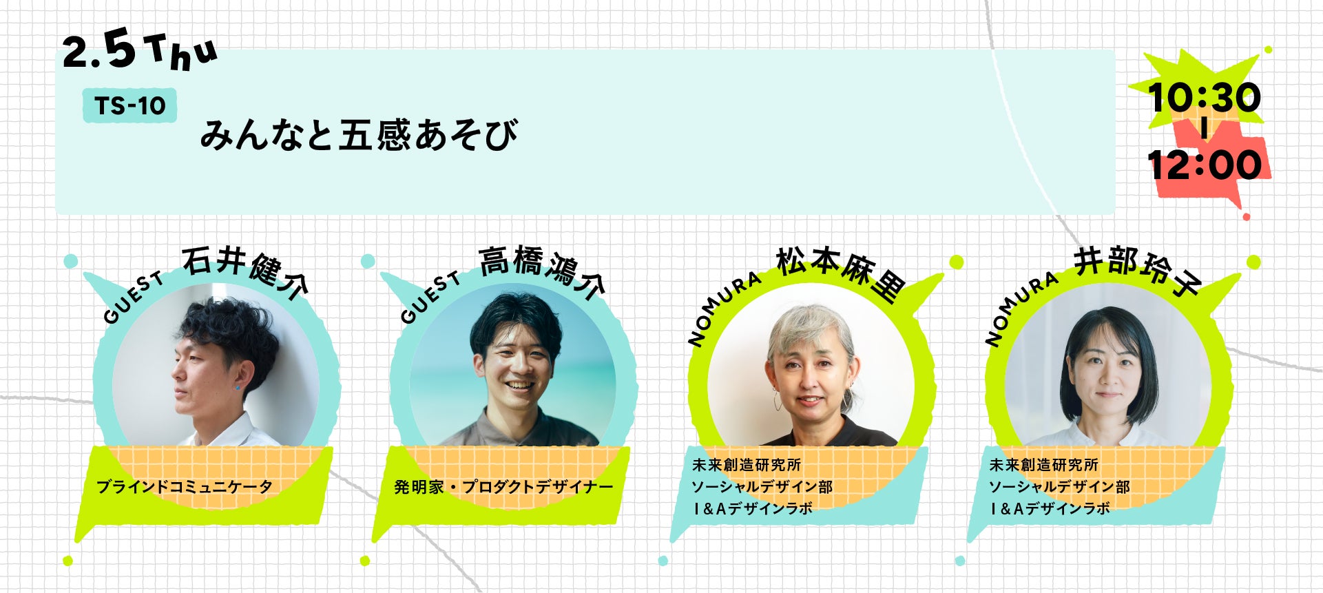 五感それぞれが持つ、違った魅力や心地よさに光を当てるトークセッションを開催します。“見る”“聞く”“触れる”——そのひとつひとつが生み出す不思議さや面白さを、発明家・デザイナー・ブラインドコミュニケーター、そして会場のみなさんとともに紐解きながら、言葉を超えてつながる新しいコミュニケーションの可能性について語り合います。当日は、会場のみなさんも参加しながら、「楽しい!」という感覚でつながる“あそび”の体験もご用意。五感をひらき、心が動く瞬間をともに味わう時間をお届けします。