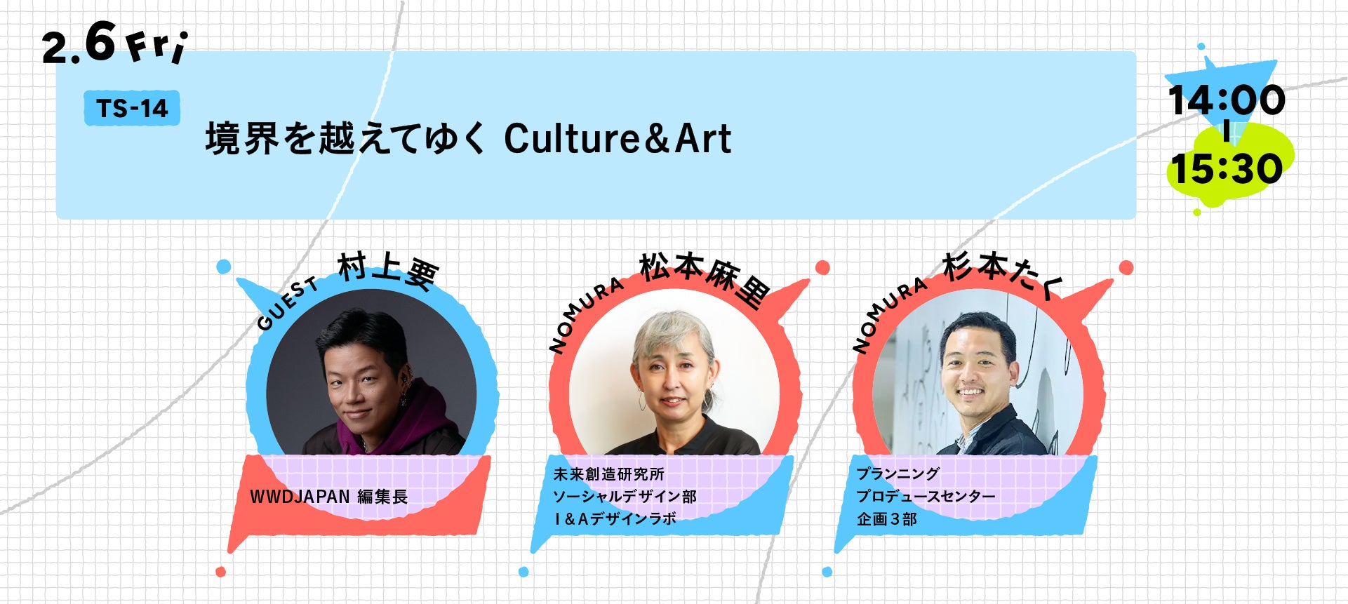 解釈のグラデーションがあり、正解も不正解も存在しないアート。その豊かな余白は、人々の心を揺さぶり、国境・性別・年齢を越えてつながりを生み出すコミュニケーションの鍵となります。私たちは、そのアートの力を信じ、これまでアートイベントや体験プログラムのデザインに取り組んできました。今回のトークセッションでは、企業姿勢を文化発信として社会に届けているメディアの方をゲストに迎え、“これからのアートと空間の在り方” を共に探っていきます。アートがもたらす新しい価値づくりや、人と空間の関係の未来についてぜひ一緒に対話し考えてみませんか。※TS-14は申し込みを締め切りました。